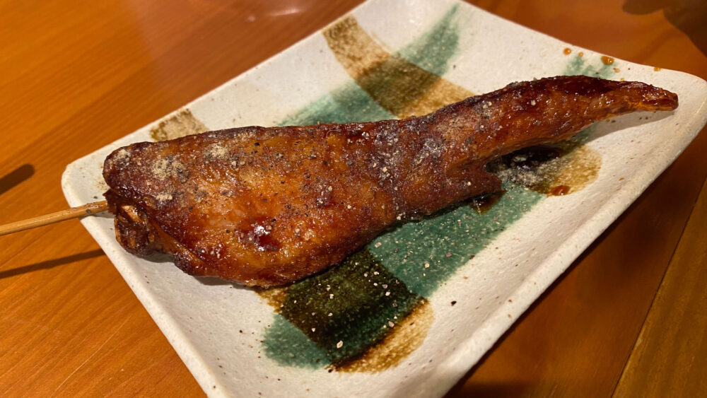 ▲てけ手羽串のタレ(税込165円)。タレ+胡椒でしっかりめの味付けでお酒が進みます。