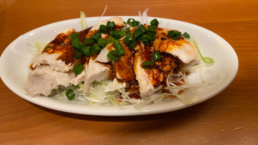 ▲しっとりよだれ鶏(税込税込418円)。てけてけで良く頼む定番メニュー。しっとり鶏肉に辛いタレとフライドガーリックが最高。