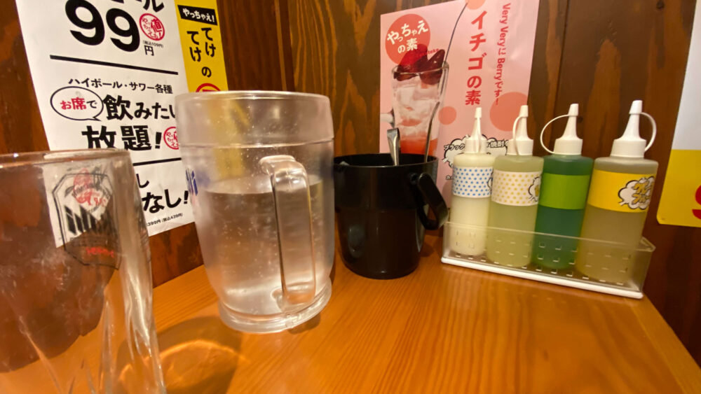 炭酸水、氷、4種のシロップ(レモン、グレープフルーツ、シャインマスカット、カルピス)は店員さんが最初に持ってきてくれます。