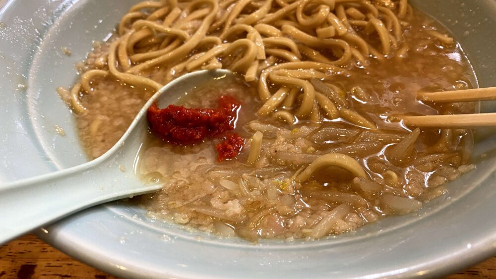 よりラーメンをおかずにすべく、卓上の豆板醤を加え、パンチ力アップです。