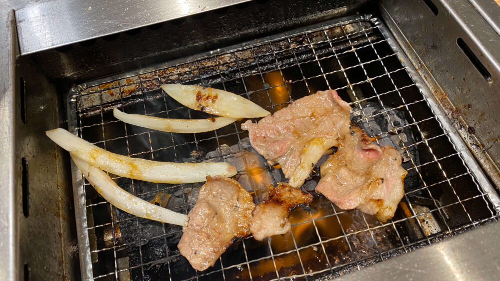 ▲さっそくカルビから焼いていきます。かなりアブラ乗っていてジューシー。ご飯とお酒が進みます。