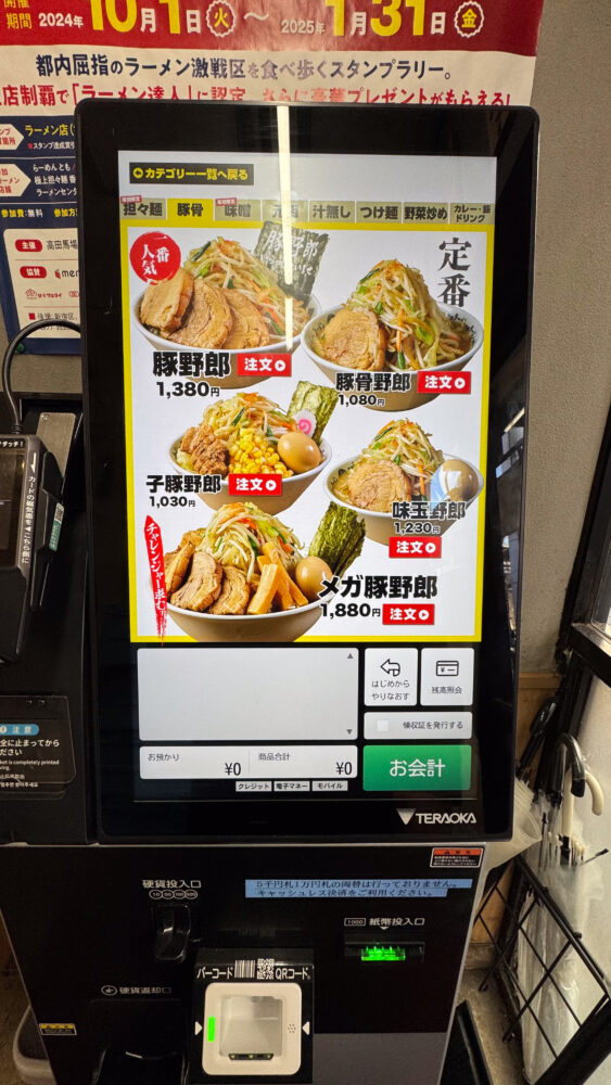 ▲デジタルな食券機で注文します。クレジットカード・電子マネー・QRコード対応なのが嬉しい。