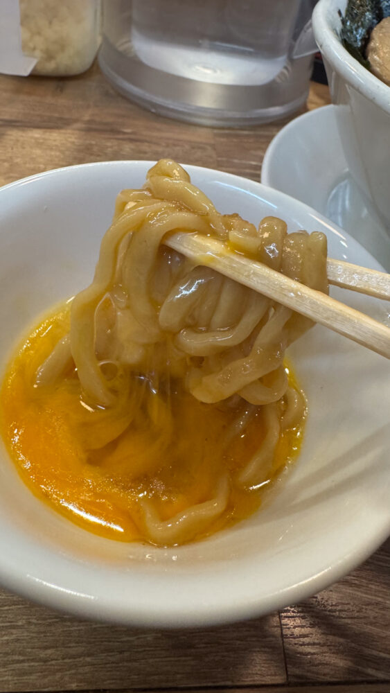 ▲中盤は、生玉子に麺をディップしてすき焼き風に味変。ベースが濃厚なので、生玉子がめちゃ合います。