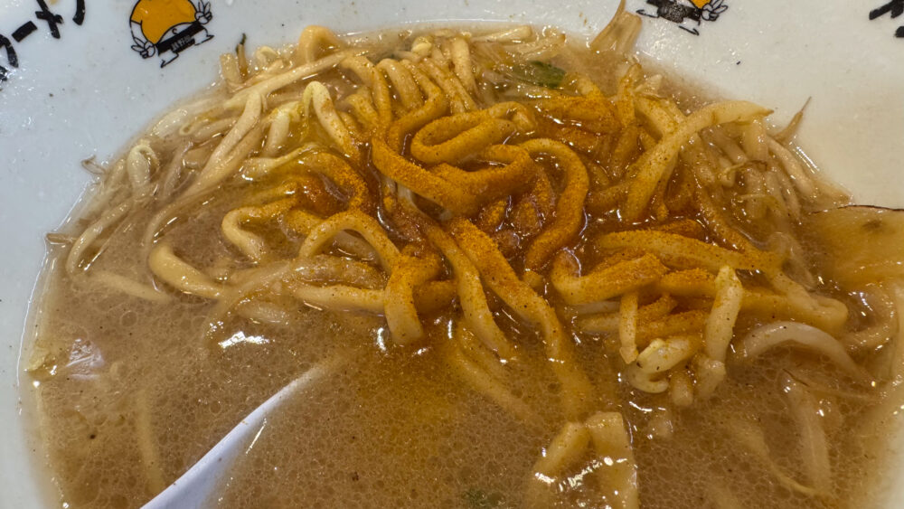 ▲終盤は卓上のカレー粉で味変。一気にカレー味になって食欲増進効果は半端ありません。