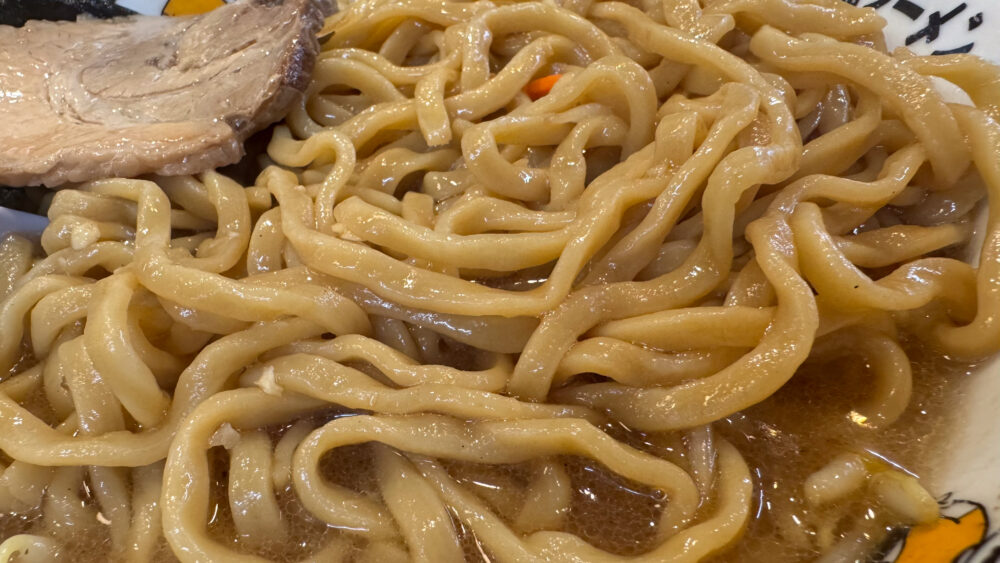 ▲麺は平打ち気味の中太麺。加水率高めですすり心地も良き。濃厚スープとマッチして美味。