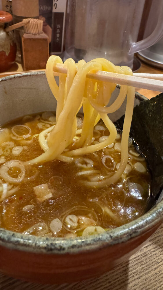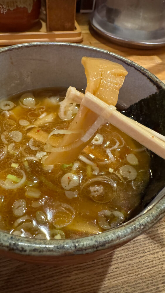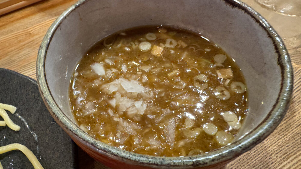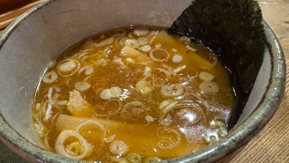 ▲つけ汁は魚介ベースのあっさり系。ほのかに甘さも感じます。