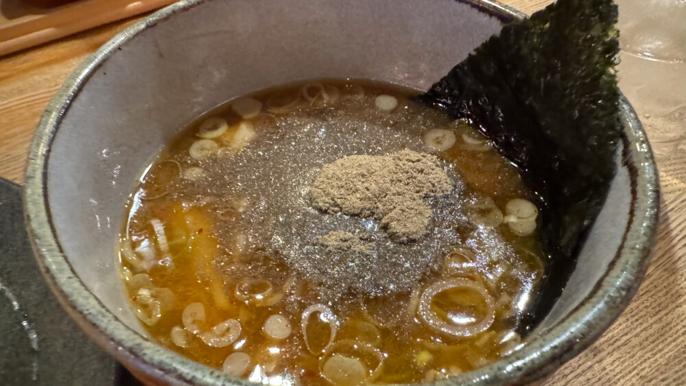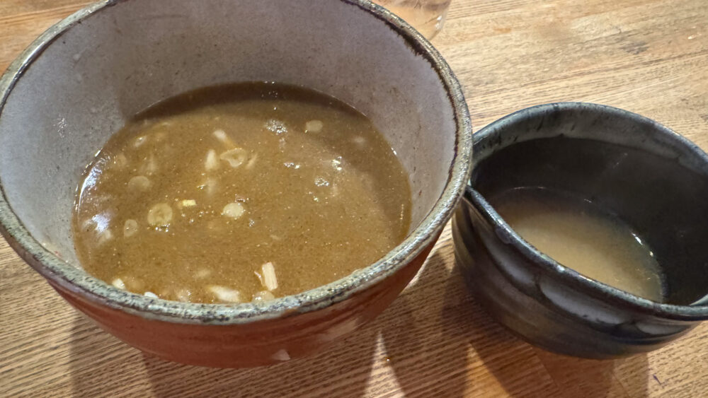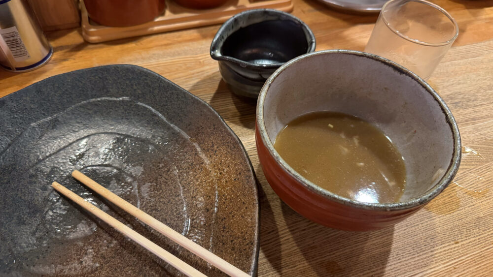 ▲麺を完食後、割スープを店員さんへお願いします。割スープで飲むつけ汁はほっと一息つける味わい。
