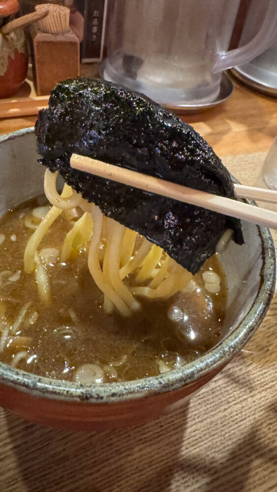 ▲貴重な1枚の海苔は、つけ汁に浸してから麺を巻いて食します。けずり節マシマシにしたので、海苔とめちゃ合います。