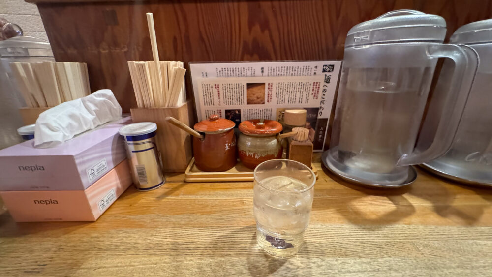▲卓上調味料は胡椒、玉ねぎ、けずり節、お酢。ティッシュが各席に配備されているのも嬉しいポイント。