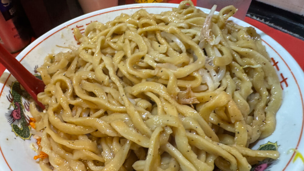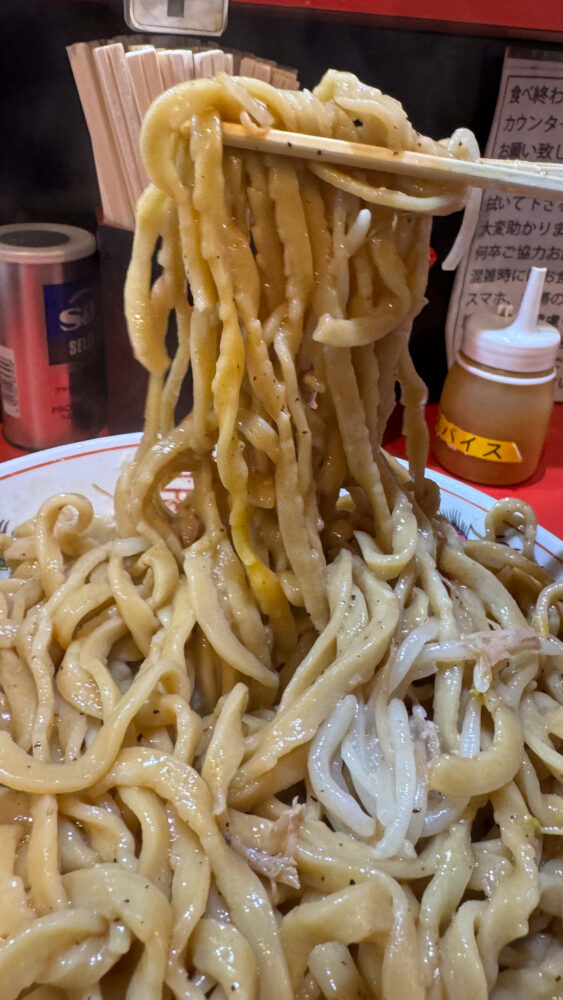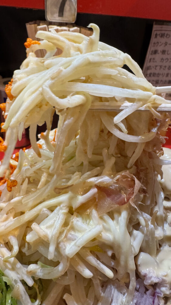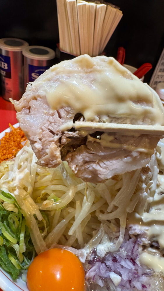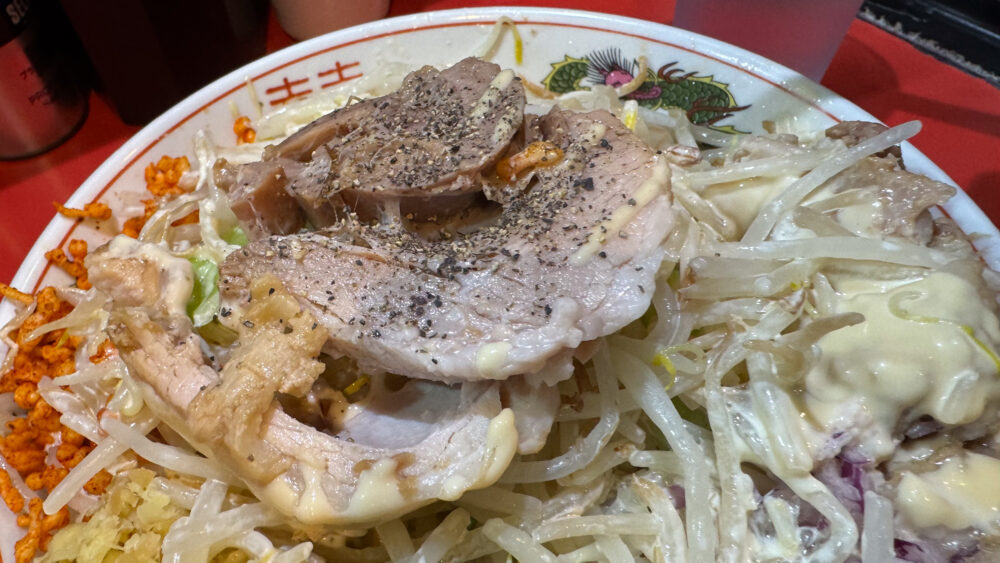 「まぜそば(大)400g(ヤサイWアブラW(辛脂)ガリマヨWショウガ辛揚げ)+豚追加2+スキヤキ」を実食!