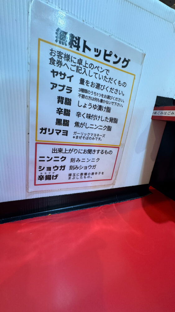 ▲各席の仕切り部分には、無料トッピングの説明も丁寧に記載されています。