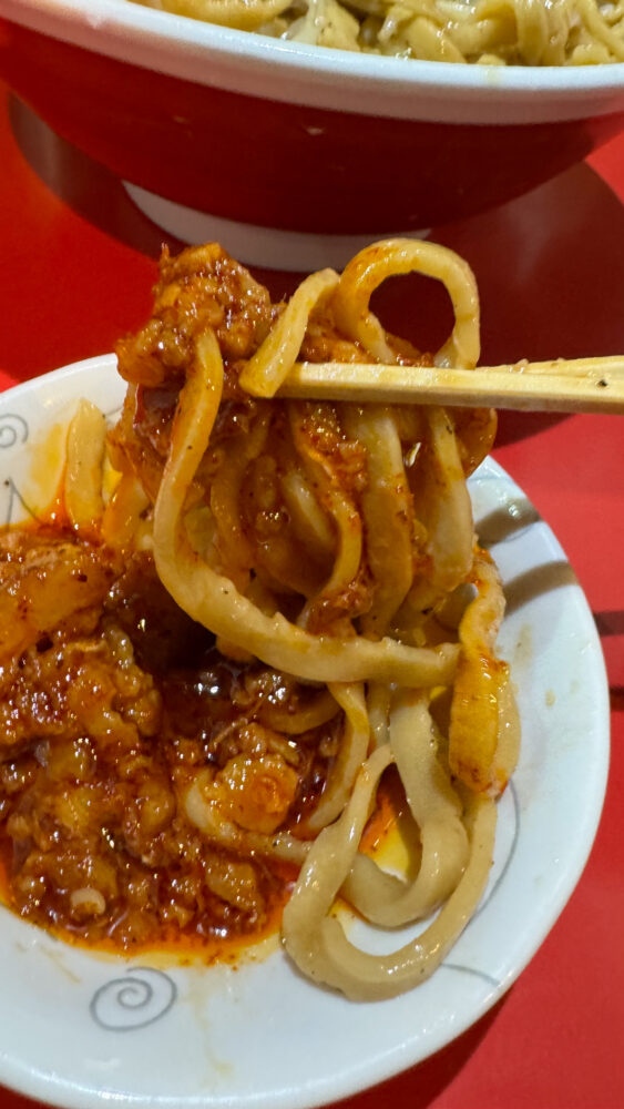 ▲別皿の辛脂に麺をディップして味変。ピリ辛で脳天に直撃する旨さ。