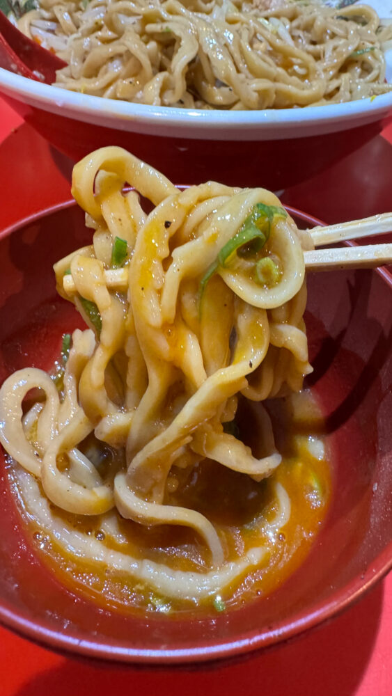 ▲麺はワシモチ食感。ラーメンの麺が違い、ギザギザしていてタレやいろいろな具材の旨味が絡みやすくて美味。