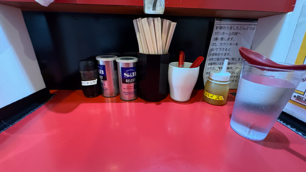 ▲卓上調味料はカエシ(ラーメンだれ)、一味唐辛子、ブラックペッパー、スパイスを完備。