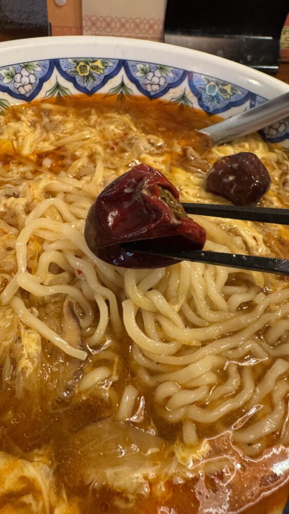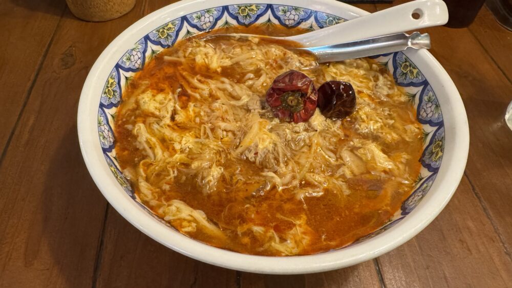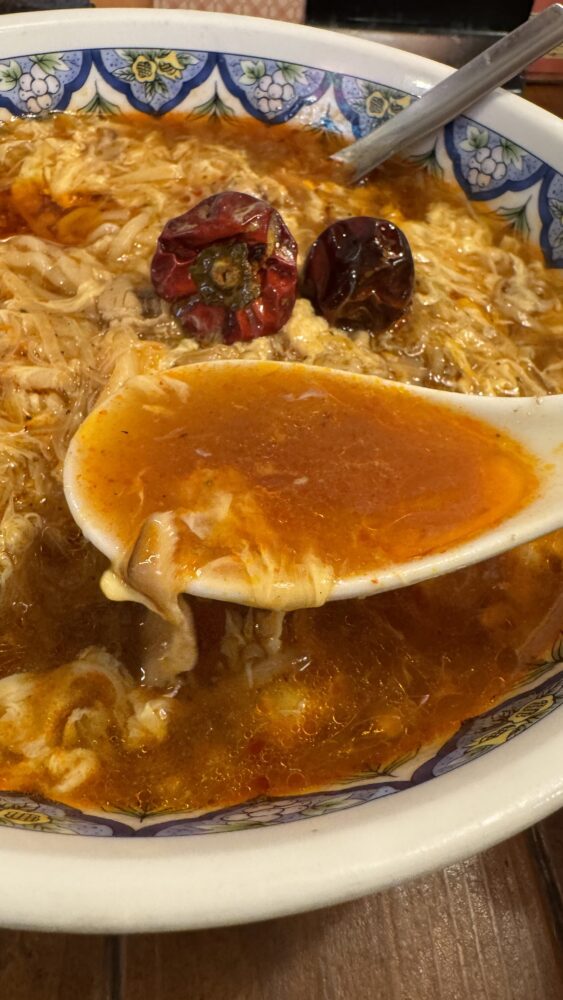 激辛スーラータンメンが着丼!通常より赤いスープに真ん中に鎮座する丸い唐辛子が印象的。