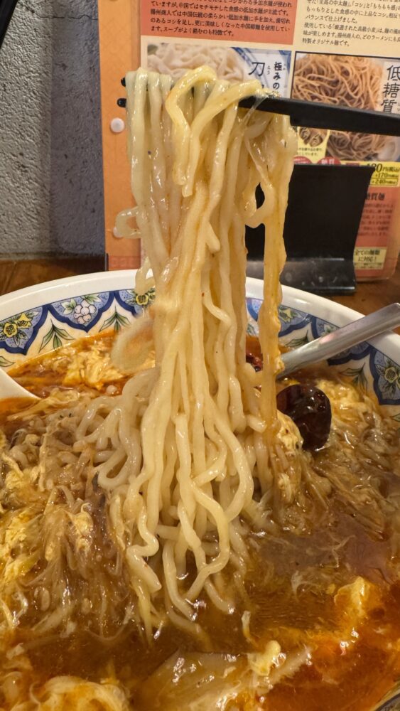 揚州商人の激辛スーラータンメンは、通常より辛味がやや強い辛すっぱ旨なスープにモチプリな麺が絡んで美味でした!
