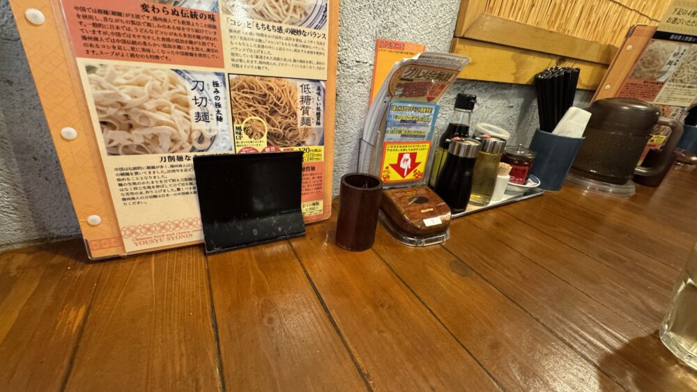 ▲この日はカウンター席。卓上調味料は醤油・黒酢・お酢・胡椒・ラー油。グルメ会員のチラシもあります。