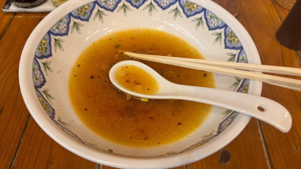 ▲中盤は卓上のラー油でピリ辛に味変。スパイシーさが上がって食べる速度が加速します。