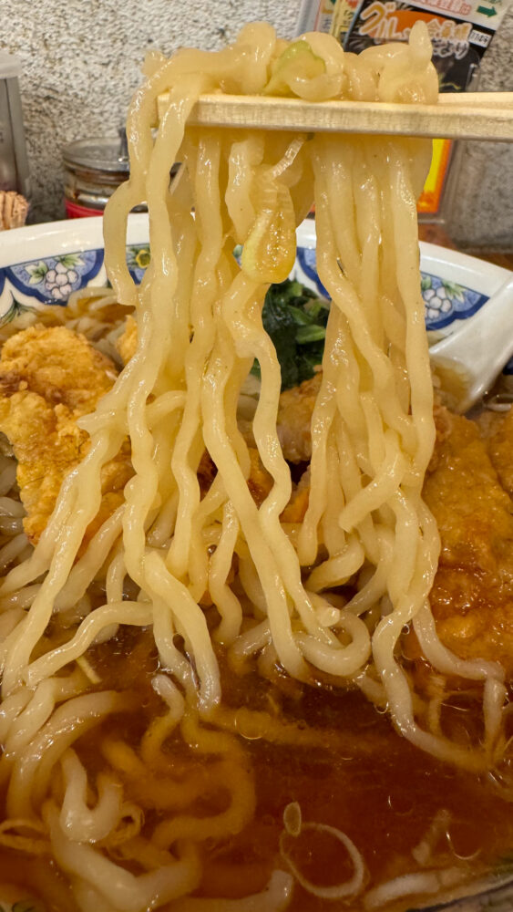 ▲麺はモチプリ食感の中太麺。醤油ベースのスープと合います。
