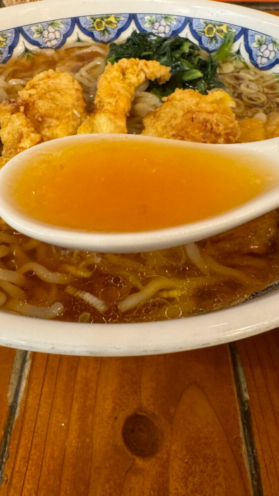 ▲スープはすっきりめな醤油でほっとする味わい。パーコーはカレー風味なので、若干スパイシーさがプラスされた部分もあります。