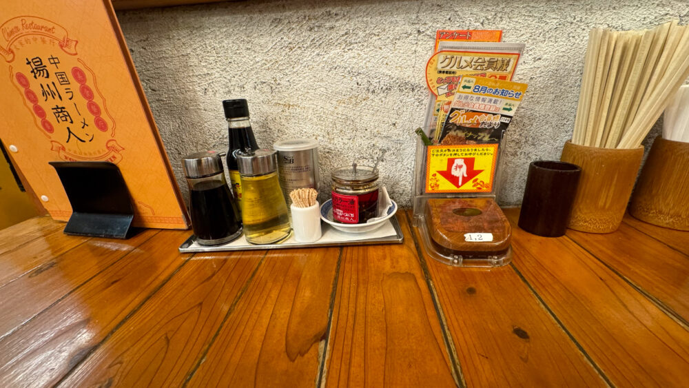 ▲この日はカウンター席。卓上調味料は醤油・黒酢・お酢・胡椒・ラー油。グルメ会員のチラシもあります。