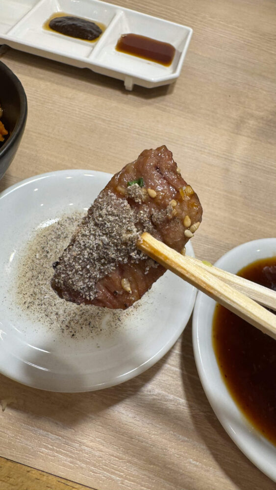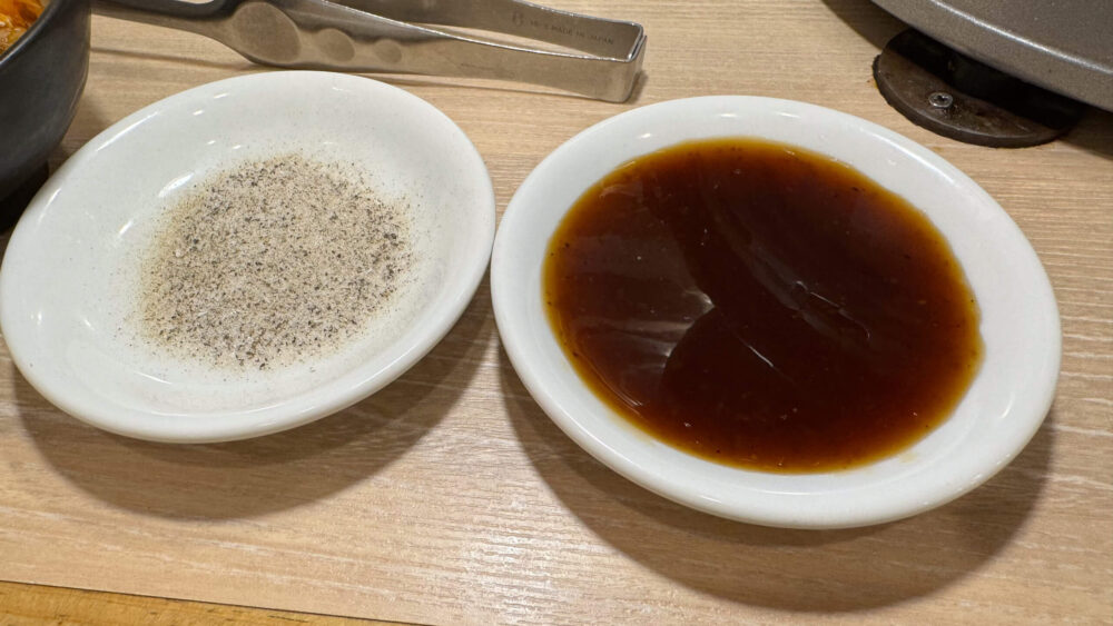 ▲1kgカルビはトリュフソース(右)と塩コショウ(左)がつきます。