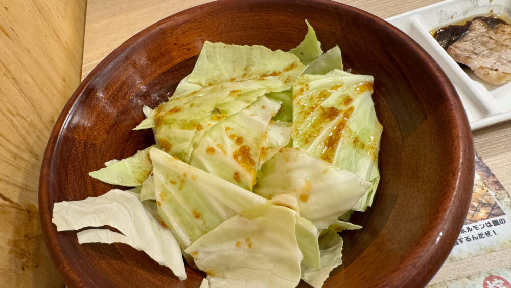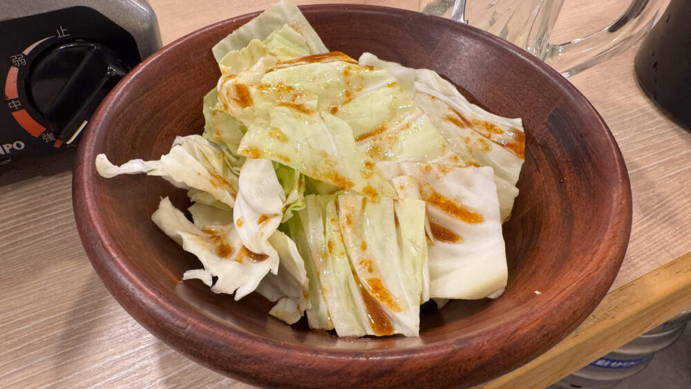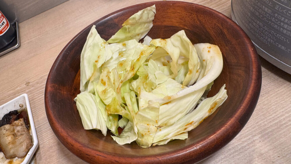 ▲待っている間にお通しキャベツをお替り。脂をリセットしておきましょう。