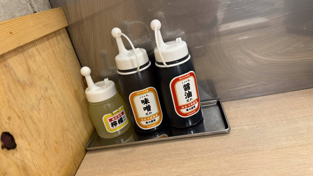 ▲卓上には醤油だれ、味噌だれ、檸檬だれも完備。