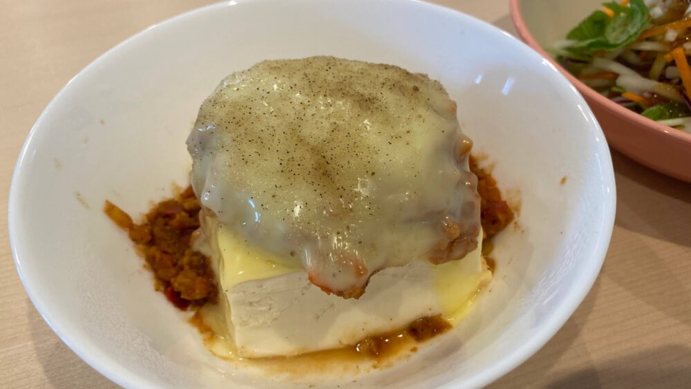 水をしっかり切った豆腐の上にタコスとチーズを乗せ、2分レンチンするだけ。約200kcalでこの満足感は凄い。胡椒たっぷりがポイント。