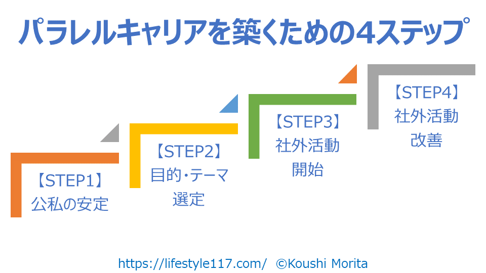 私見ですが、会社員がパラレルキャリアを築くために4ステップを順番に踏んでいく必要があると考えます。