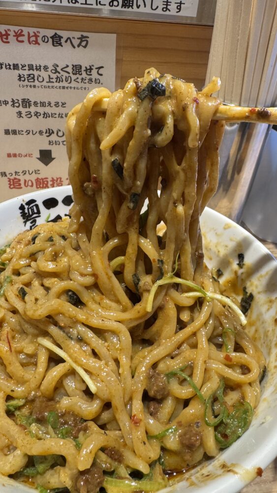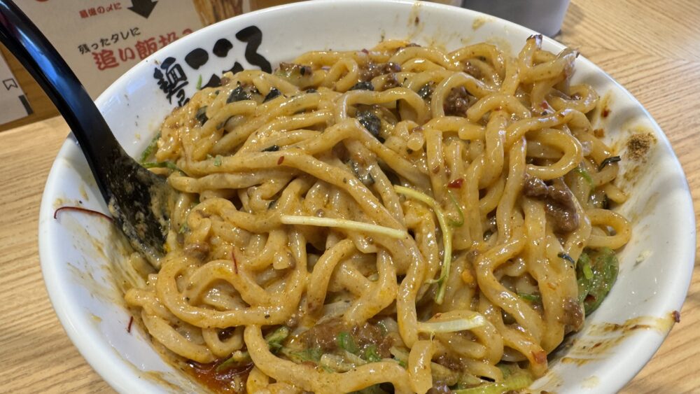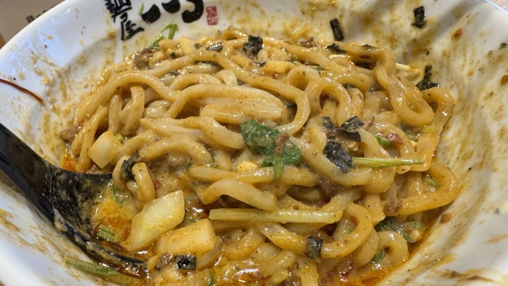 ▲最初に麺を具材やタレとしっかり混ぜ合わせていきます。担々麵っぽくラー油も底の方にがっつり入っています。
