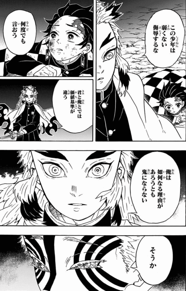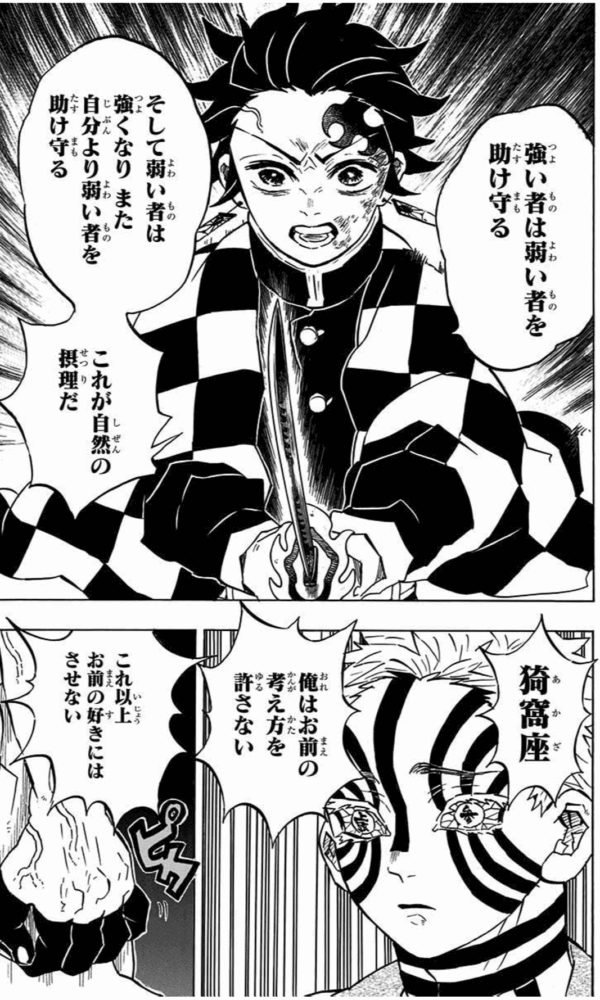 無限列車のミッションを達成したと思ったところで登場した上弦の参・猗窩座(あかざ)から炭治郎を侮辱されての一言。