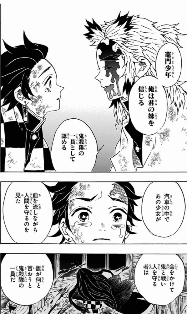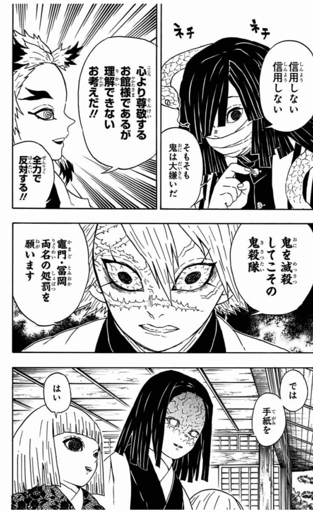 しかし、無限列車の任務の中で、禰豆子が身を挺して人間を守る様子を見て、最後には禰豆子のことを鬼殺隊の一員として認めます。