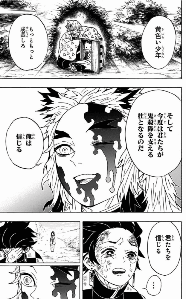 猗窩座との激闘の末、最期に炭治郎たち後進へエールを送ります。