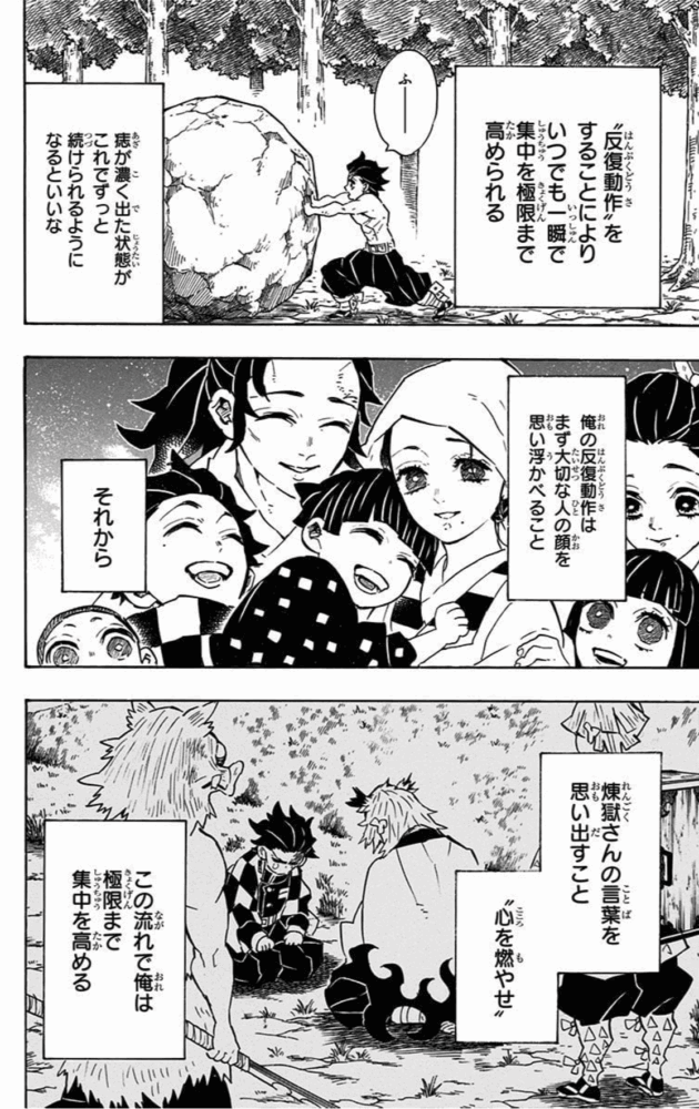 全集中と別のアプローチで人間の身体能力を高めることができる“反復動作”の訓練の中で、煉獄さんの言葉を思い出すことも炭治郎の「ルーティン」の一部になっていますね。